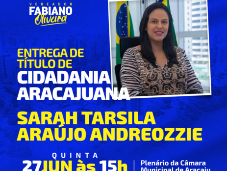 O vereador Fabiano Oliveira (PP) concede o Título de Cidadania Aracajuana à secretária de Estado da Fazenda  Sarah Tarsila Araújo Andreozzie nesta quinta-feira, 27, às 16h, na Câmara Municipal de Aracaju. Sarah Tarsila Araújo Andreozzi nasceu em Brasília no dia 14 de julho de 1984. Estudou Ciências Econômicas na Universidade de Brasília (UnB) e durante esse tempo foi vice-presidente da Federação Brasileira de Empresas Juniores e presidente da Federação de Empresas Juniores do Distrito Federal. Ainda durante a faculdade também foi...